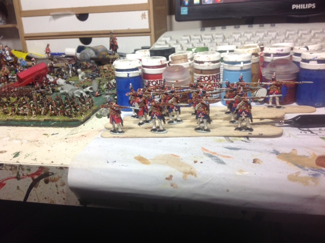 On the bench are the 28mm Scots Fusiliers, half are just about finished and the second half started.
